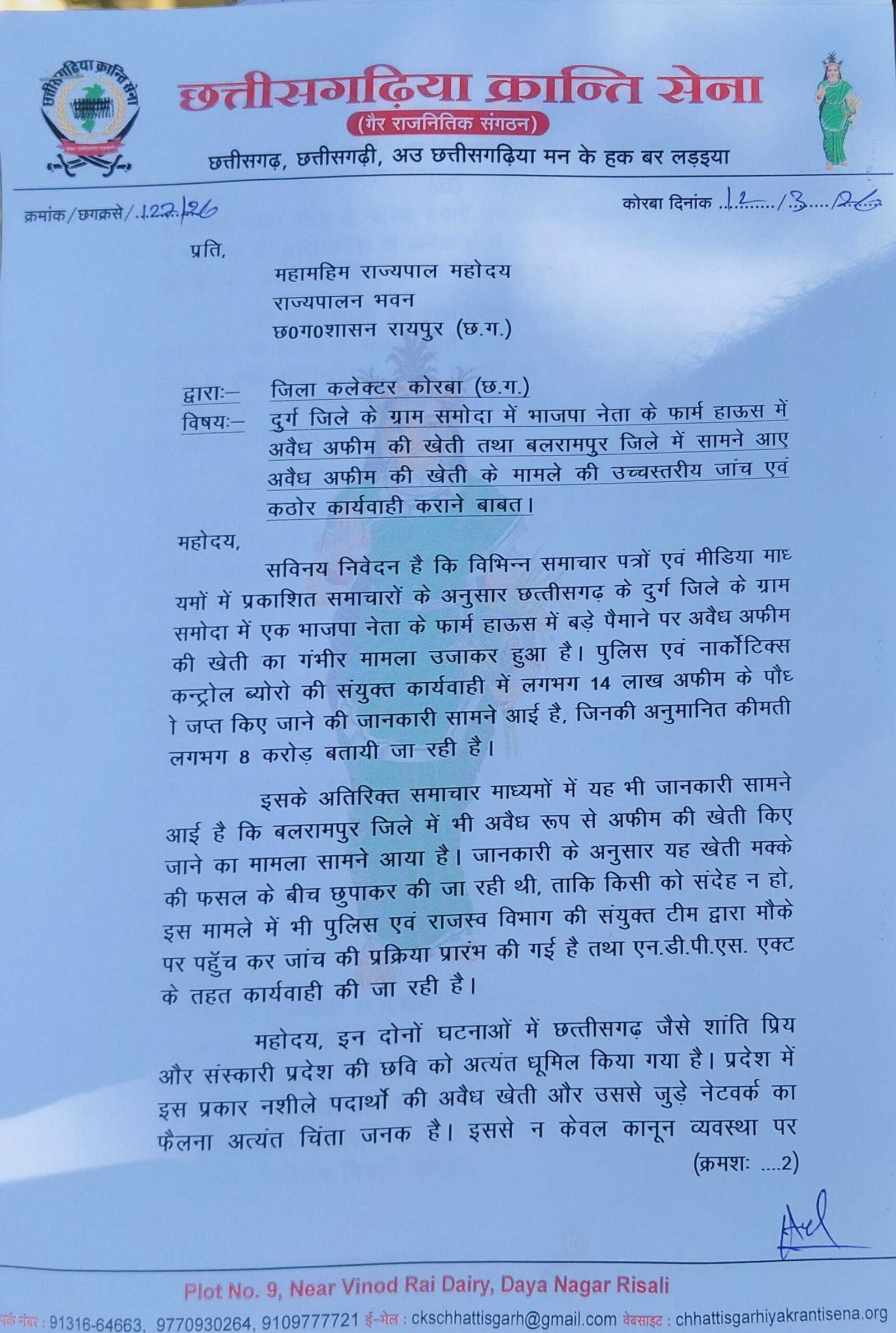 वहीं, राज्यपाल के नाम सौंपे गए दूसरे ज्ञापन में छत्तीसगढ़ के शांत वातावरण में फैलते ‘नशे के जाल’ पर चिंता जताई गई है।