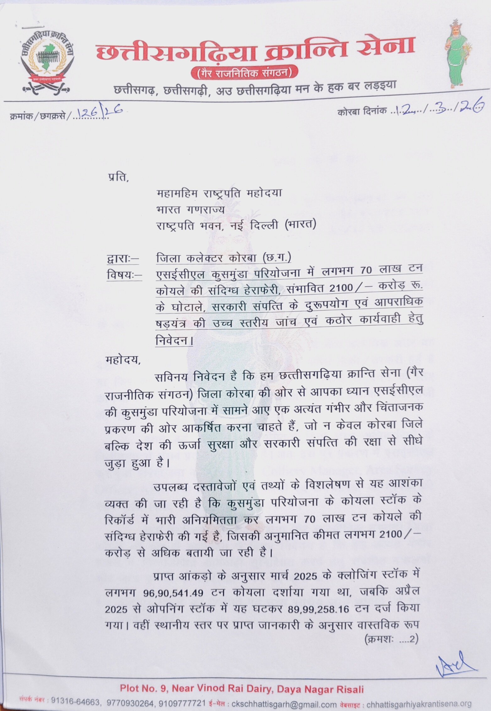 संगठन द्वारा राष्ट्रपति को भेजे गए पत्र में SECL की कुसमुंडा परियोजना में 70 लाख टन कोयले की संदिग्ध हेराफेरी का आरोप लगाया गया है।