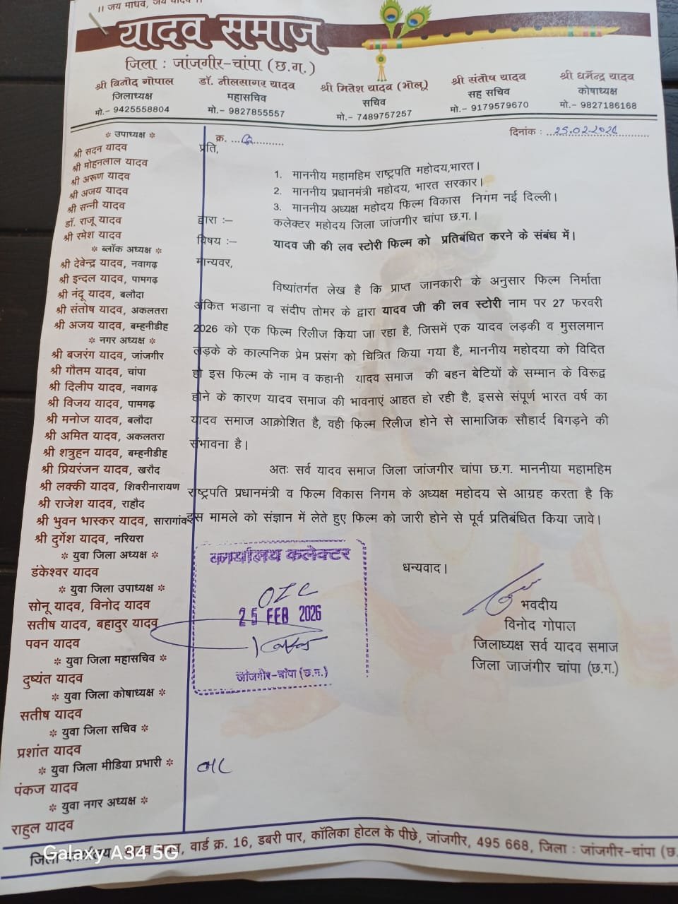 जांजगीर-चांपा: आगामी 27 फरवरी को रिलीज होने वाली फिल्म ‘यादव जी की लव स्टोरी’ को लेकर छत्तीसगढ़ के यादव समाज में भारी आक्रोश है। सर्व यादव समाज जिला जांजगीर-चांपा ने फिल्म को समाज के स्वाभिमान के खिलाफ बताते हुए कलेक्टर के माध्यम से राष्ट्रपति, प्रधानमंत्री और फिल्म विकास निगम के नाम ज्ञापन सौंपा है।